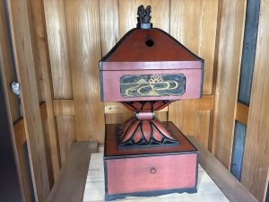 箱に灰を敷きつめ、その上に木型を置いて溝を作り、そこに抹香を持って端から火をつけ、香の進んだ長さで時間をはかります。
