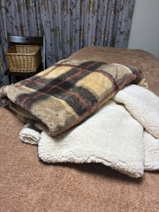 寒い日もサロンはぬくぬくですが、さらにこのブランケットにふんわりと包まれていただきますよ!