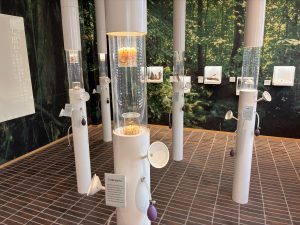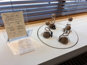 薫習館の1階では、お香の材料が展示され、単体の香料やお香の香りをかぐことができます。